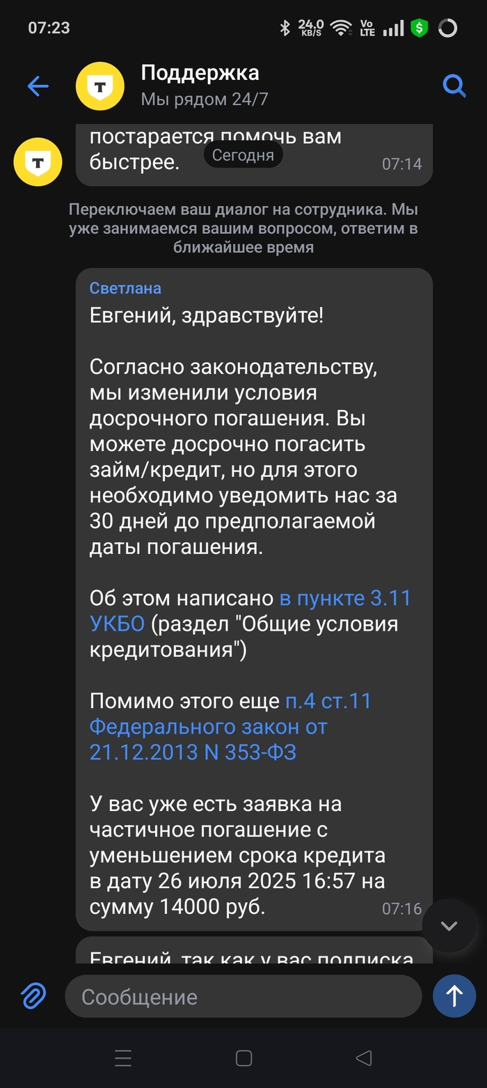 Не так давно был взят кредит в вышеупомянутом банке, ранее я уже брал там кредит и гасил досрочно без каких либо вопросов и проблем. К моему удивлению теперь для того чтобы досрочно внести платеж необходимо оставить заявку и платеж можно внести только по истечении 30 дней. Ни о каких изменениях кредитного договора не уведомили все сделали в одностороннем порядке, при этом ссылаясь на свои же правила в которых никого четкого определения нет, лишь размытая формулировка с отсылкой к ФЗ. Если дойдут руки обращусь в Центробанк для разъяснения правовой позиции. Снизу скрин для подтверждения.Надеюсь хоть кому то это поможет. Естественно по окончании выплат отношения с этим банком будут прекращены. На всякий случай ставка по кредиту 40% просто для понимания уровня происходящего абсурда.