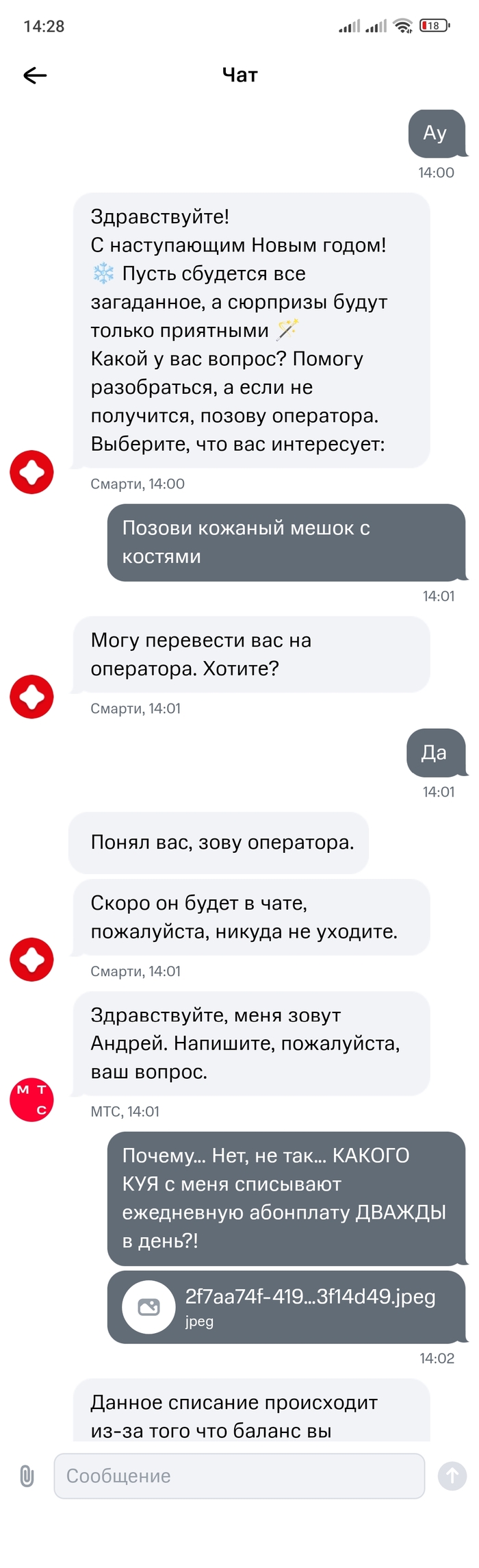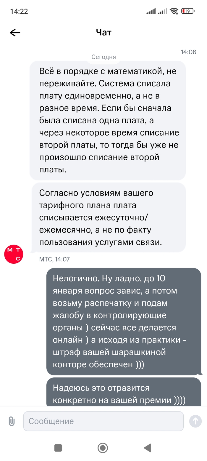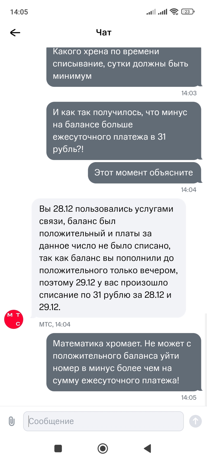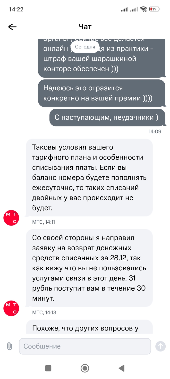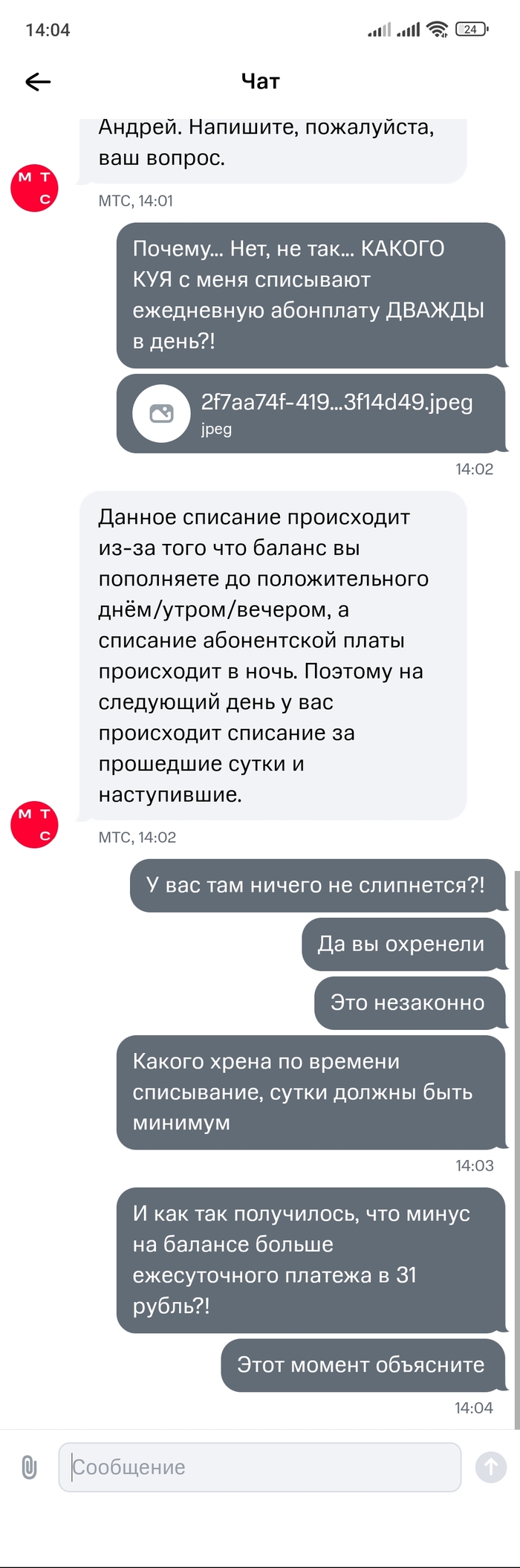 Буквально только что отбил копейку у МТС обратно на счёт. Да, сумма маленькая, но дело принципа ) мне удобно именно ежедневное списание, т.к. не каждый день пользуюсь сотовой связью, и в мои планы не входит платить за неиспользуемые дни.
