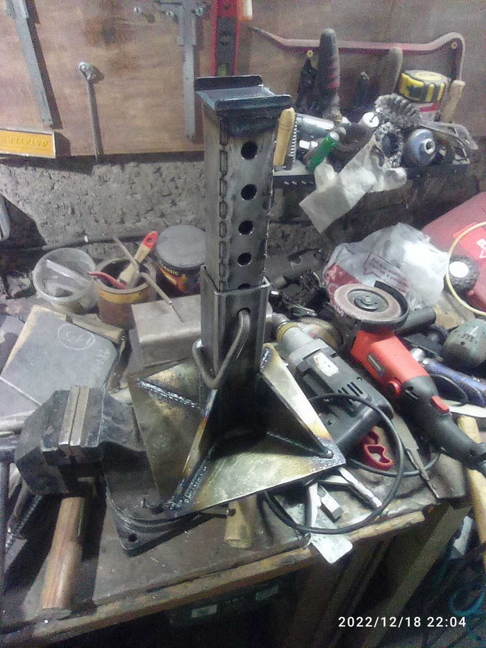 Делаем поддомкратник из стали 2мм, так же под него делал "место" в этой ↑ детали, вырезал в деревянном бруске углубление по форме поддомкратника, положил на брусок деталь, сверху поддомкратник, и бил кувалдой)