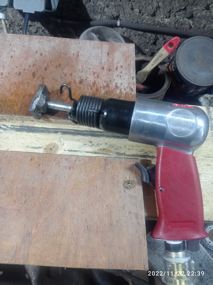 Изготавливаем нижнюю часть крыла. Для этого я взял пневмомолоток, сделал для него насадку в виде прямоугольника, шириной равной кантику, из кусков фанеры и доски делаем "канавку" в которой будем стучать деталь.