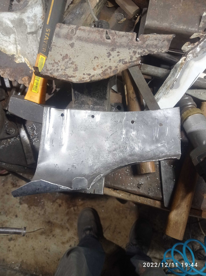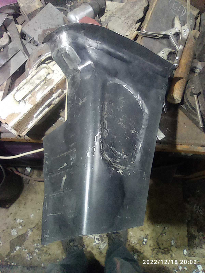 Далее изготавливаем внутреннюю арку, очень помог бы в этом "гладильный молоток", делаем. На фото временное решение с проволокой, далее был куплет трос от багажника ваза, сделана педаль и система рычагов для нажатия кнопки на пневматическом молотке.