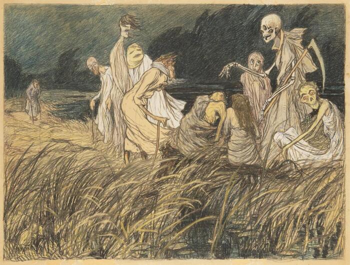 Вот эта картина - "Смерть заглядывает в окно умирающего" травмировала меня в детстве. Боялась, что на дачу в окно заглянет это глистообразное