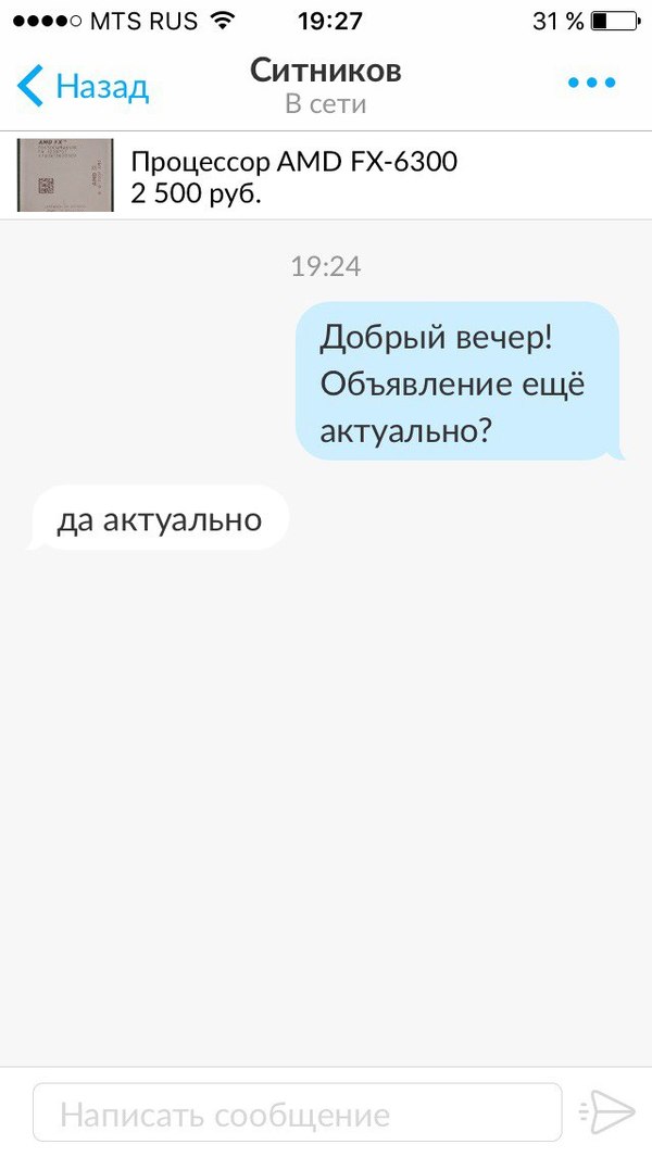 Весь следующий день он мои сообщения не видел. Пока я с другого аккаунта ему не написал "Актуально ли объявление?". Что вы думаете? "Да актуально"