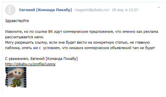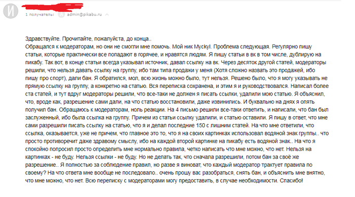 Спокойно пишу еще несколько писем, с периодичностью в несколько часов, с просьбой определить мне четко, что можно делать, что нет, что готов соблюдать правила, но прошу четко написать мне какие ссылки и картинки можно выкладывать. Спустя двое суток мне ответили. Ответ был гениальным…