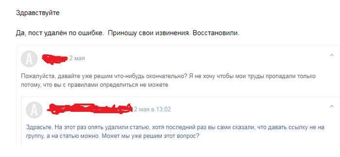 Во всех статьях далее я давал ссылку на статью, и это не вызывало никаких вопросов. Не прошло и года, как очередная ябеда-корябеда в комментариях под очередным постом позвала модератора, с целью наказать автора за рекламу группы (хотя ссылка была прежней, на статью). Пришел модератор, и, не разбираясь, удалил статью. Написал я модератору, что мне ранее было разрешено давать такие ссылки, в ответ тишина. Через несколько часов написал еще раз. В ответ пришло «Извините, пост восстановили». Поста восстановили, естественно без «плюсиков» и рейтинга.