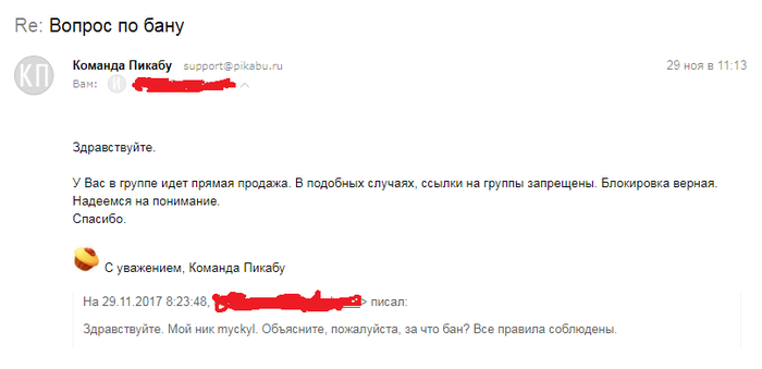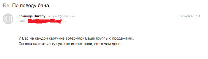 Далее пересылаю модераторам переписку ранее, с РАЗРЕШЕНИЕМ модераторов писать ссылку на статью. В ответ тишина. В итоге написал 3 письма, с разницей в несколько часов, с просьбой разъяснить мне правила, что готов их соблюдать, если мне их четко определят. Ответ я получил только спустя сутки. И модератор сказал, что, оказывается, бан мне уже не за ссылку, а за водяной знак группы, который я использовал на прикрепленных к статье картинках.