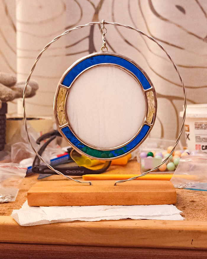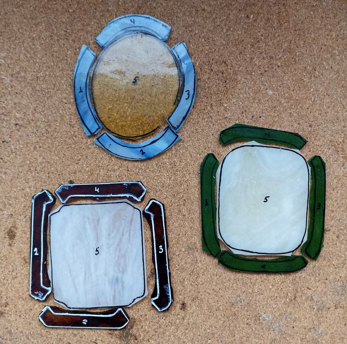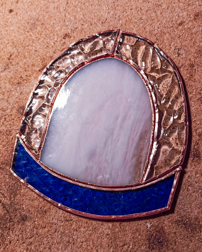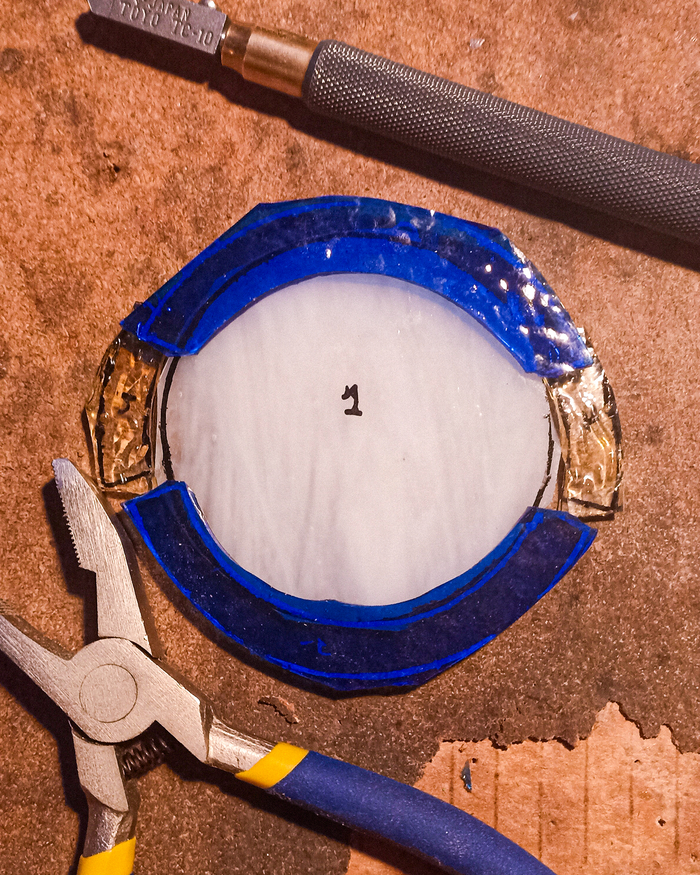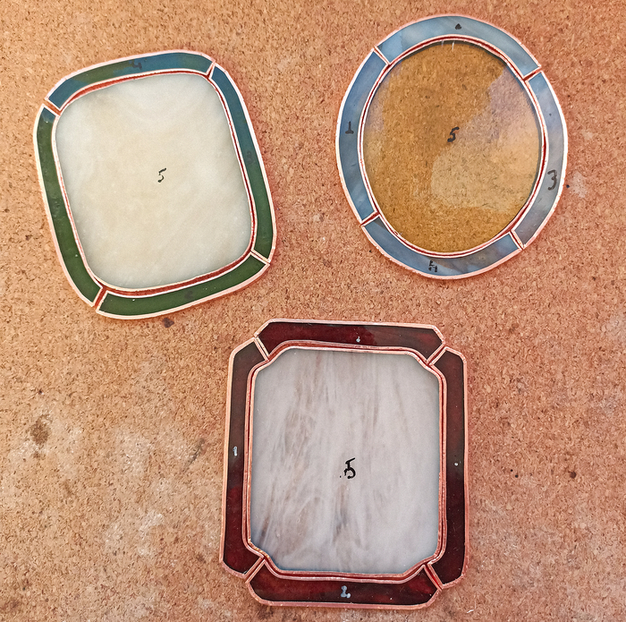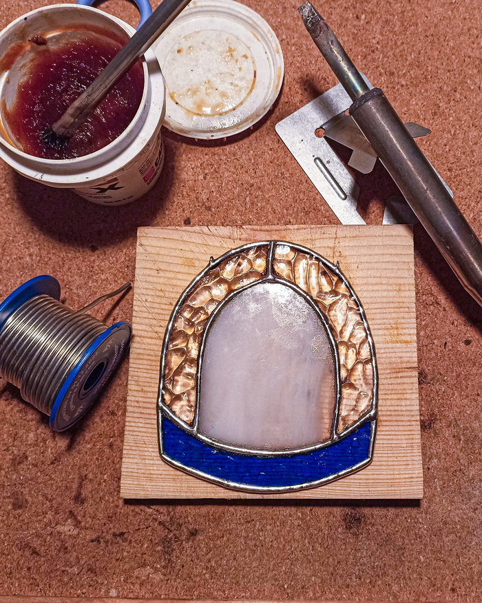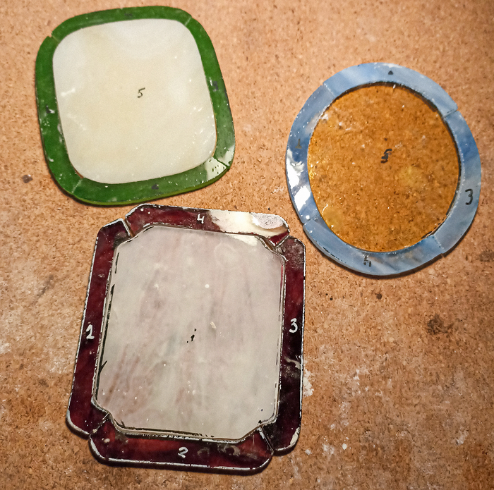 Обрабатывал заготовки по витражной технике Тиффани — показывал чуть подробнее в прошлых постах. Этот этап оказался довольно простым, ведь кусочки стекла не собирались в единый витраж.