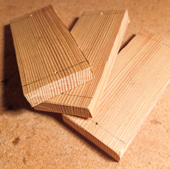 Дальше шлифовка брусков. Начал со шкурок с зернистостью Р60, чтобы убрать все неровности после распила, и закончил Р240. После этого покрыл бруски воском и сразу же накрутил проволоку и сделал подвески.