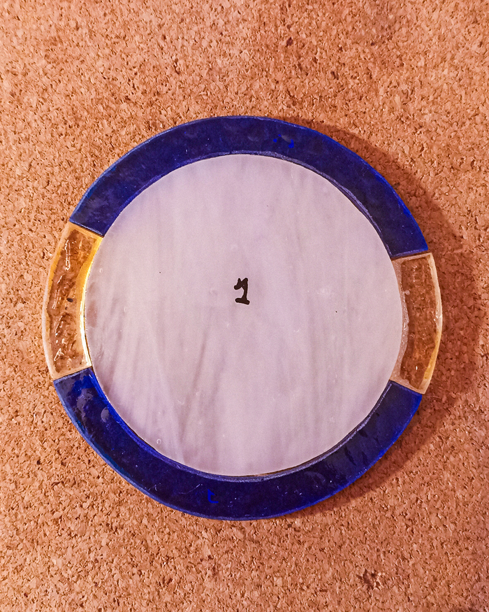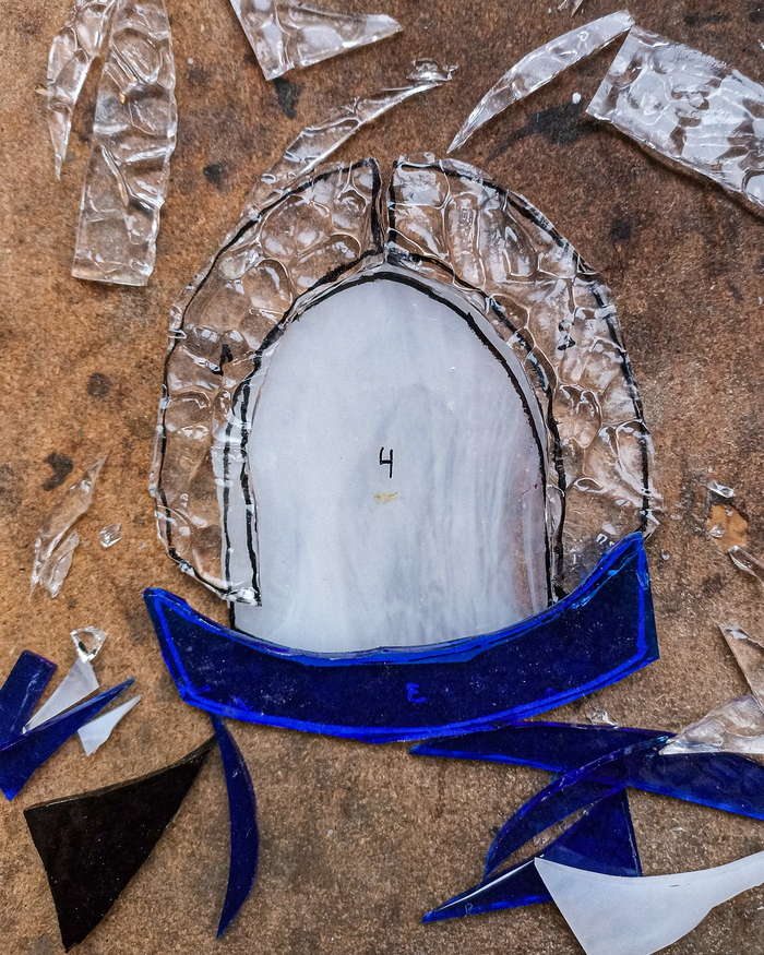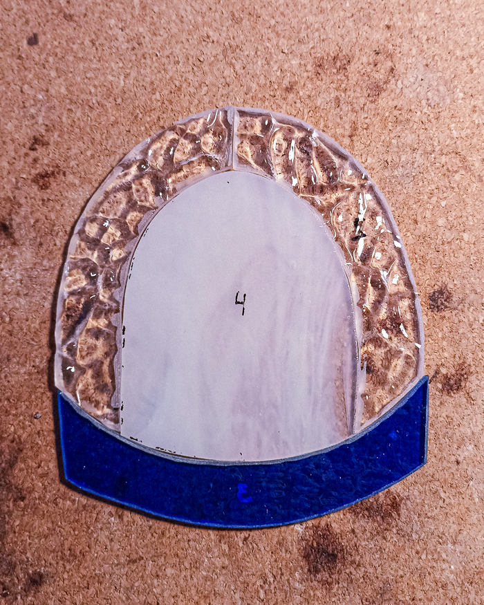 Нарезал стекло. Тут, признаюсь, к своему стыду, – нижняя синяя часть треснула. Взял слишком острый угол. Пришлось вырезать заново. Всегда так жалко, когда хороший кусочек стекла уходит в никуда… в коробочку для осколков🙃