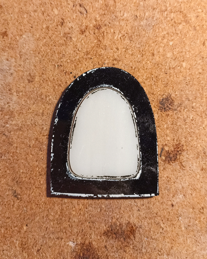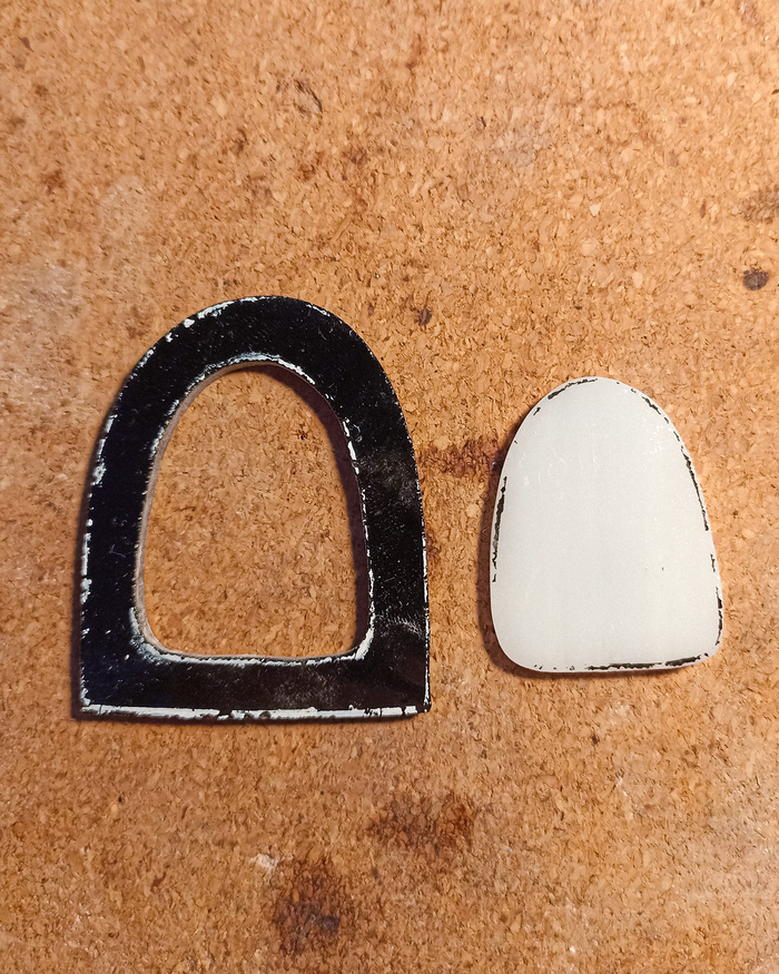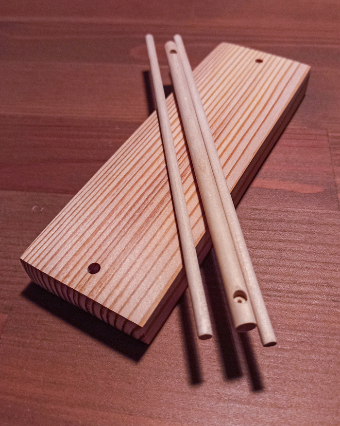 На задней стороне гравером сделал небольшие выемки и приклеил туда маленькие деревянные полоски — это будущие отверстия для ленты. Тоже очень долго думал над формой отверстия, пробовал разные варианты на тестовых подвесах, которые всегда получались неровными. В итоге остановился на скрытом варианте.