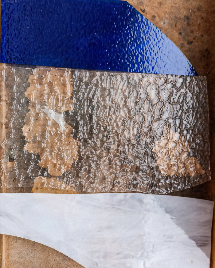 Думал, будет сложно работать с фактурным стеклом, но оно оказалось вполне себе послушным. Для справки, у фактурного стекла рельеф только с одной стороны, а с другой — гладкая поверхность, по которой и режут. Осколки собираю в коробочку — вдруг когда-нибудь появится печка для стекла, и я их запеку во что-то новое!🙂