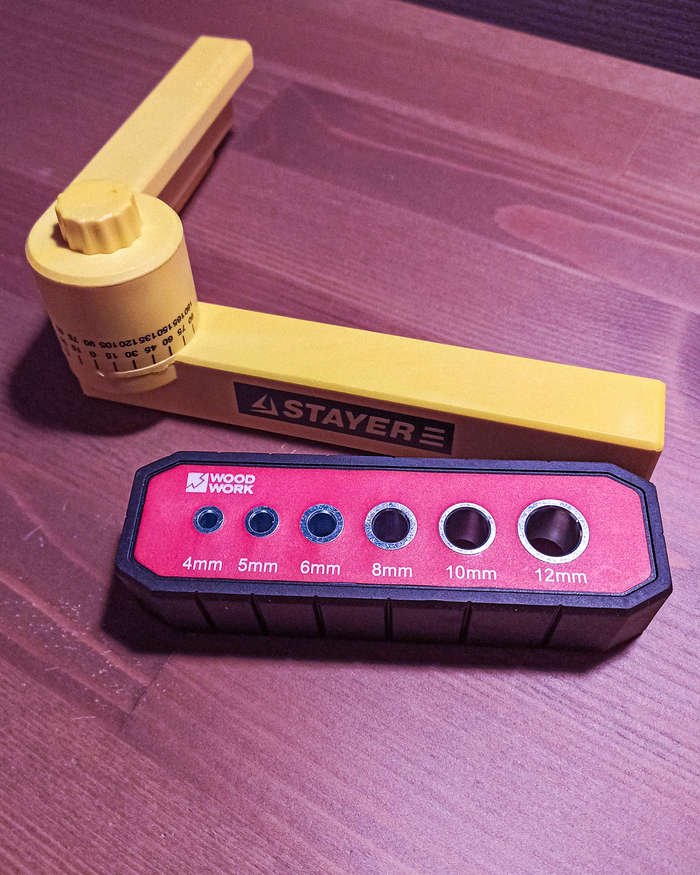 Теперь про обновочки! Купил стусло для ровных распилов и кондуктор для сверления. Пока выбирал, перечитал кучу отзывов: кому-то инструмент попался кривой, у кого-то пластик хлипкий, но мне повезло — всё работает как надо. Особенно порадовал кондуктор: отверстия под 90 градусов — это прям кайф, сразу с первого раза🙂