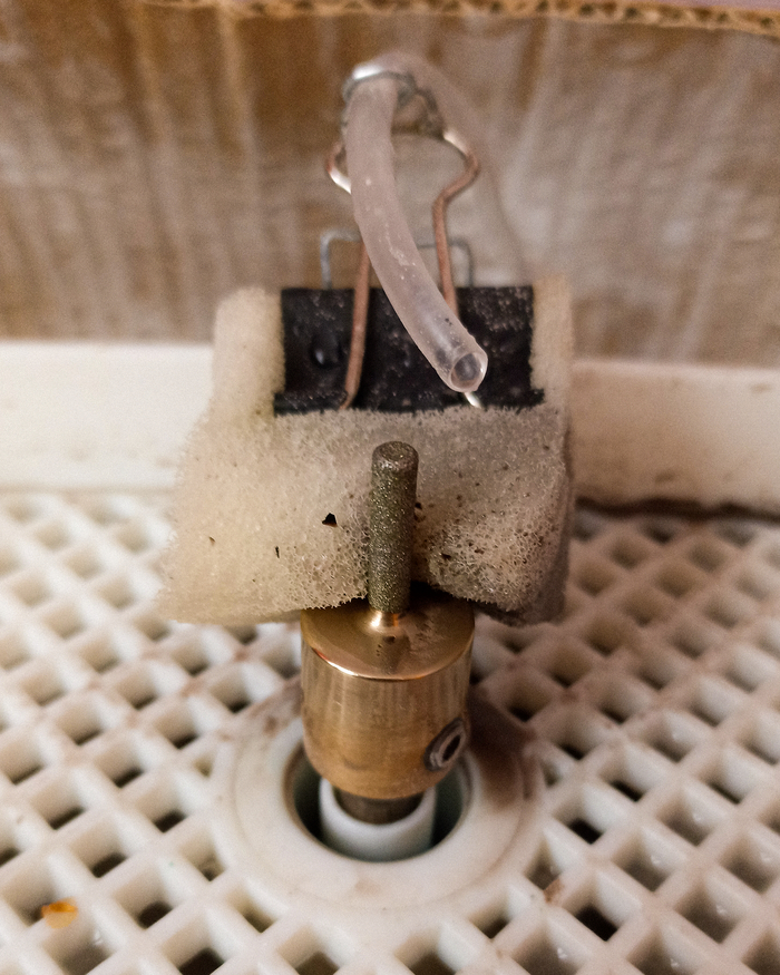 После небольшой паузы для размышлений, решил сменить тактику. Сделал внутри одно отверстие и прошелся этой насадкой по внутреннему периметру. Не хотел так делать, потому что алмазный слой насадки быстрее изнашивается. Одно дело снимать неровности с кромки, а другое вышлифовывать кучу стекла. Но, увы.