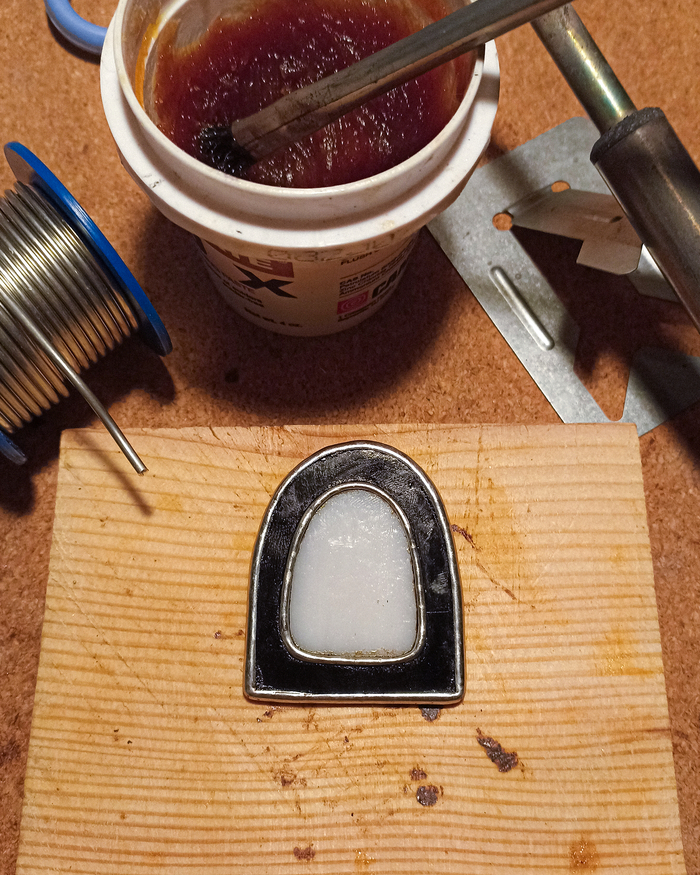 Паял паяльником на 100Вт, потому что изделие не маленькое. Бессвинцовый припой требует более высокой температуры, да и зима на балконе уже вступила в свои права🥶, так что надо быть осторожным, cтекло может треснуть, если слишком быстро его нагреть. Здесь сложным местом были ушки для подвеса, они упорно не хотели ровно припаиваться, но я их всё-таки убедил)