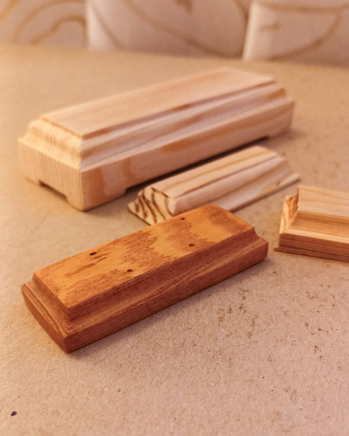 В какой-то момент смотрю на заготовку и понимаю, что она слишком светлая, ни с дубом, ни с сосной в цвет не попадает. Начал эксперименты с морилкой, где-то нанес в один слой, где-то в два слоя, где-то чуть подшлифовал после нанесения. В конце ещё покрыл маслом. Думаю цвет получился подходящим.