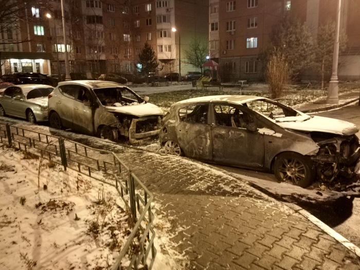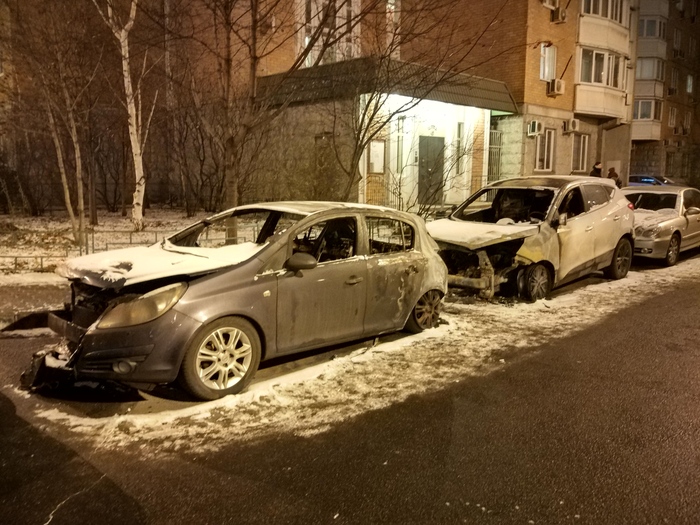 Увидел по дороге домой. Похоже у малолитражки замкнуло что то справа под капотом, дальше пламя пошло в салон и там уже перекинулось на туссан. Счётчик сгоревших машин во дворе достиг 3х, несколько лет назад сгорел gla, тогда правда пожарные пытались тушить. Жалко людей, выйти утром (к примеру) и увидеть такое, заряд "бодрости" на весь день.