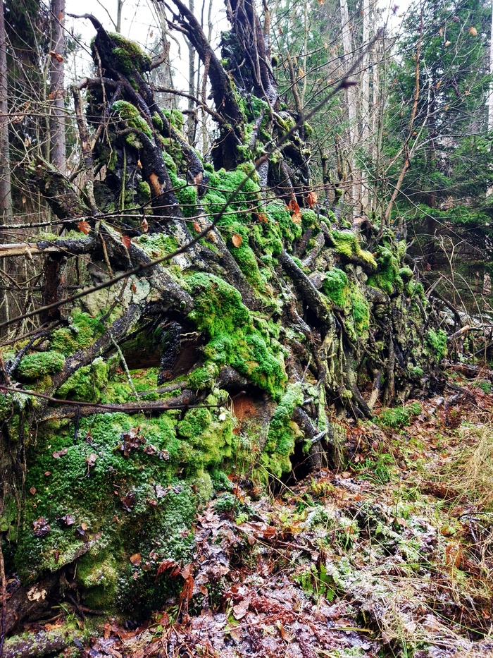 Провели сегодня разведку по лесам вокруг приобретённого участка, с целью оценить лес на пригодность к собирательству. Оказалось что весь лес по большей части состоит из болот и завалов после урагана. А так же нашли вот такую "скульптуру" - высота данного природного бонсайя в районе четырёх метров. В живую выглядит вообще потрясающе.