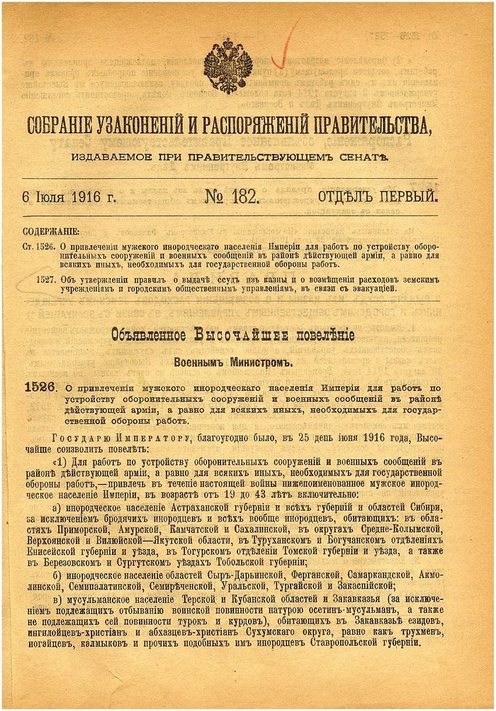 «В Семиречье, на границе с Китаем, в июле 1916 г. распространились нелепые слухи о том, что "русские хотят отобрать самый здоровый элемент мусульман, послать на театр военных действий на работы впереди русских солдат, где русские и германские войска их перебьют, и таким образом будет достигнута задуманная русскими цель уничтожения мусульманства". Степь заволновалась, а молодежь призывного возраста начала собираться в банды дезертиров»