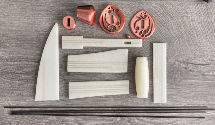 Далее готовлю файлы к печати и запускаю принтеры. Печаталось все из PLA, для клинка и рукояти U3Print PLA Natural, остальное из Eryone Silk Copper PLA, получил комплект для сборки: