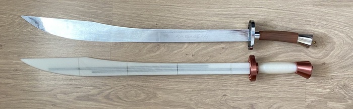 В целом, свои задачи он выполняет, с ним отрабатываются формы с мечом Тайцзицюань, говоря простым языком (не совсем корректно) - "гимнастика с мечом", без каких либо ударов. Для травмобезопасности металлическое лезвие меняет толщину от 3мм у основания до 0.6мм у конца, и при замахах он гнется издавая характерные звуки большой металлической линейки. Так же деревянная рукоятка не самая удобная, слишком тонкая.