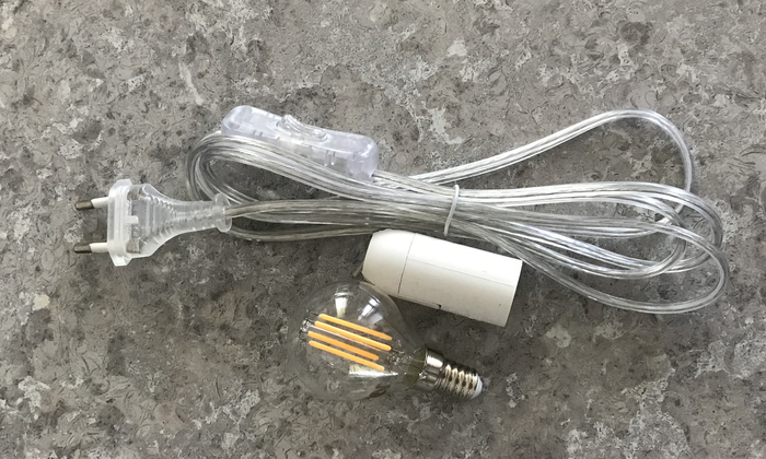 Готовлю начинку. Для этого был приобретен патрон под цоколь е14, шнур для светильника в сборе и лампа. Хотел взять лампу Эдиссона, но в наличии подходящего размера не нашлось, взял филаментную светодиодную, о чем несколько пожалел позднее, ибо по яркости она ни разу не декоративная: