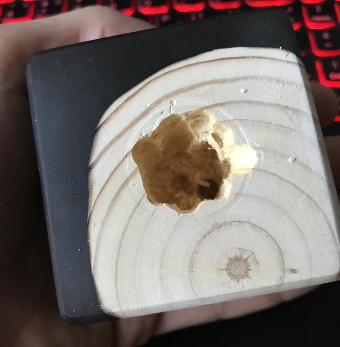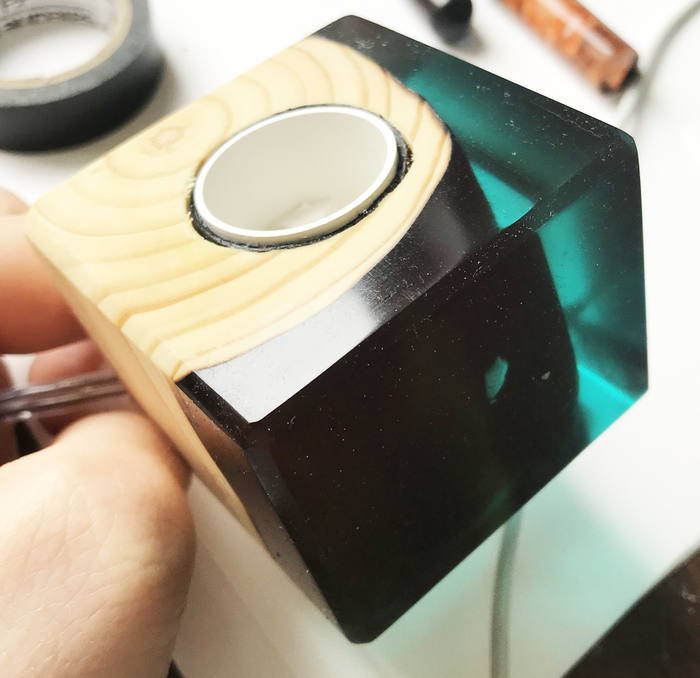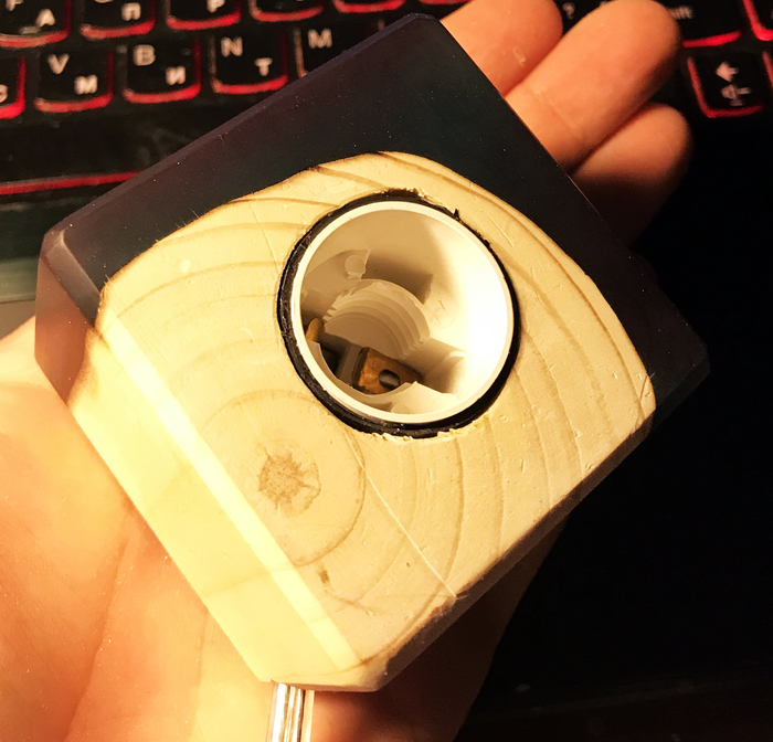 Понимаю, что перестарался с диаметром места под патрон, но это не страшно, изоленты ведь много не бывает) Провод вывел с угла деревянной части.