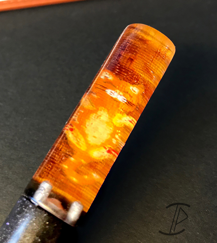 Теперь можно и поверхности вывести, удаляю царапины (пару особенно крупных брать с дерева полностью не вышло, слишком глубокие оказались), полирую пастой для автомобильных фар смоляную часть, дерево пропитываю льняным маслом: