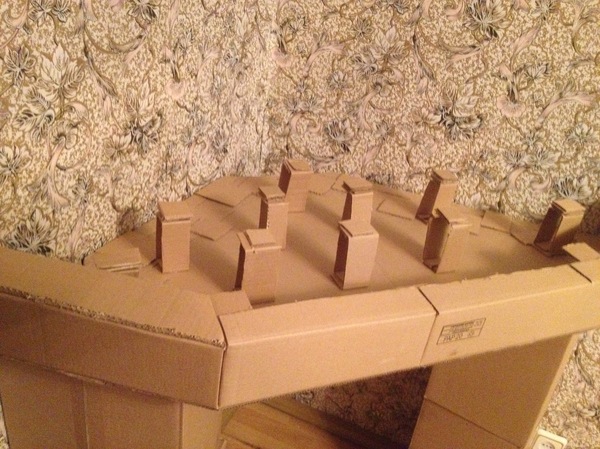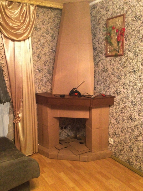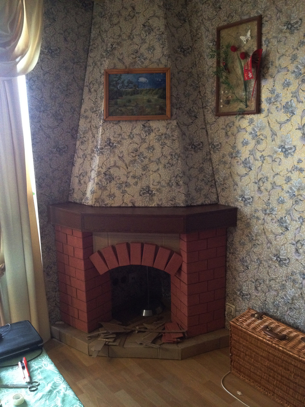Из большого листа картона и остатков обоев делаю дымоход. Не знаю, что бы я стал делать, если бы обои не сохранились (10 лет меня ждали). Тем временем краска подсохла, начинаю крепить кирпичи.