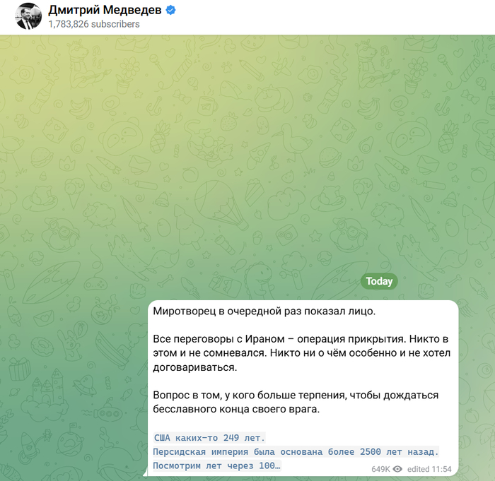 Все резко стали специалистами по Ближнему Востоку и Ирану, так что и я присоединюсь. Дмитрий Медведев в своём ТГ-канале обрушился со справедливой критикой на империалиста номер один.