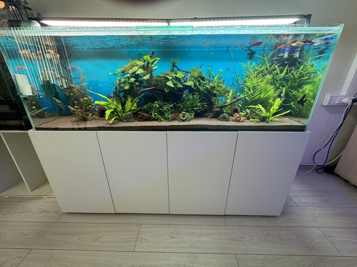 Имеем 2 аквариума: пресный габаритами 180х60х60 и объемом 640 литров, а так же морской габаритами 120х55х55 и объемом 350 литров и с сампом на 80 литров приблизительно.
