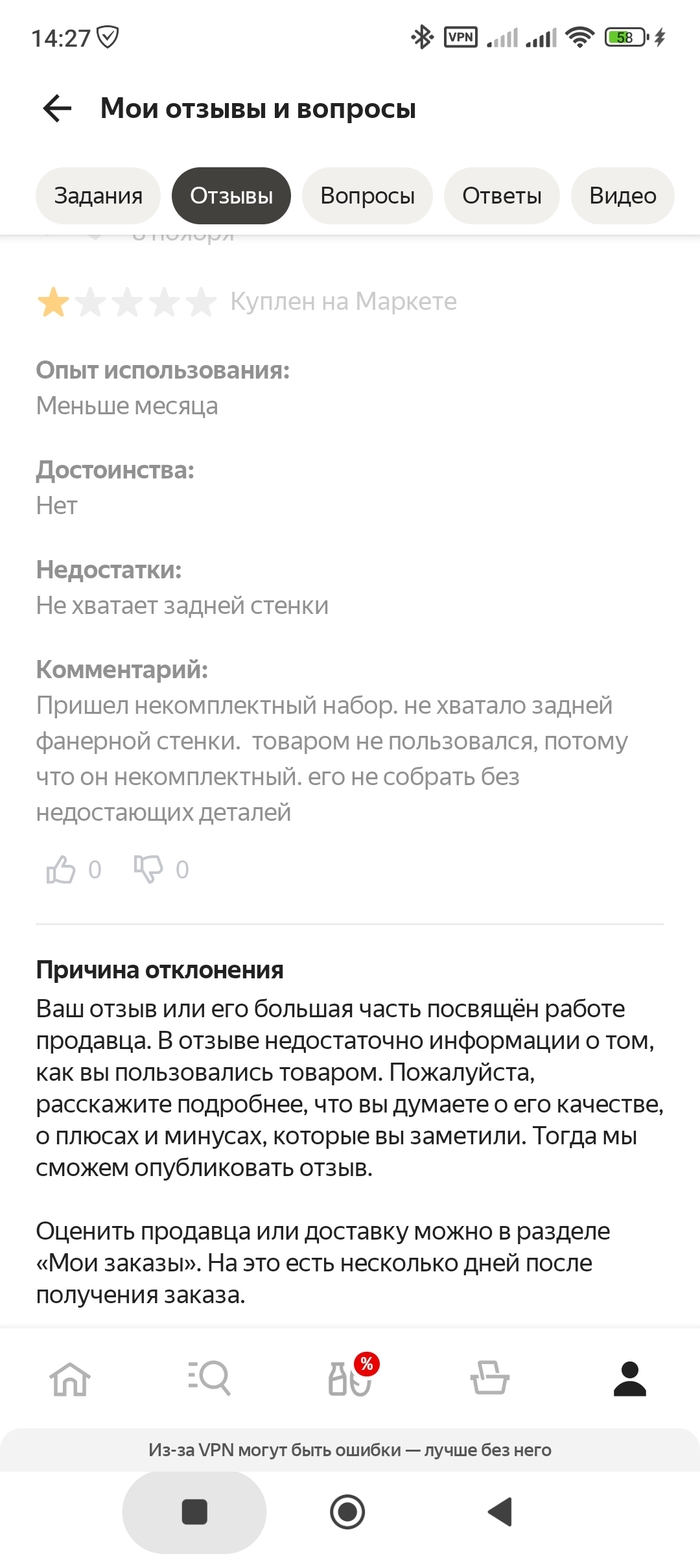 Шкаф привез курьер. Передал коробку и уехал. Когда начал собирать, обнаружил что не хватает задней стенки из двп. Написал в ЯМ. Ответили, попросили подождать пару дней. Через два-три дня ответили, что не смогли связаться с продавцом (типа он им не отвечает). Предложили сделать возврат. Но шкаф мне нужен. И снова делать возврат, снова заказывать такой же шкаф, а потом думать придет ли на этот раз полный комплект, я не захотел. Поехал в Леруа Мерлен, купил там окрашенный двп, там же заказал распил в необходимых размерах и собрал шкаф. После этого решил оставить отзыв на продавца в приложении ЯМ. Но его заблокировали. По причине того что я больше описал приложений к продавцу, а не к товару. Отредактировал отзыв, написал по товар, ни слова о продавце. Иии снова заблокировали. Тогда уже просто решил выложить на Пикабу.