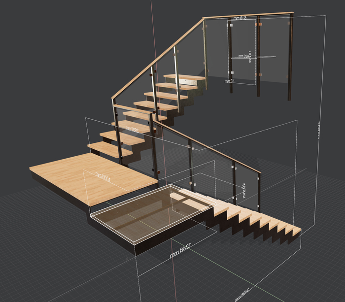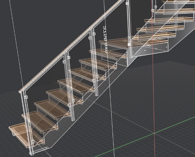 Под капотом это работает так: на вход программы подаются габаритные размеры. Мы в 2D создаём контур детали по точкам. Из этого контура формируются 3D-модели каждого элемента лестницы, потом они собираются воедино и расставляются по своим местам, рендерим результат. Первые версии программы выглядели так: