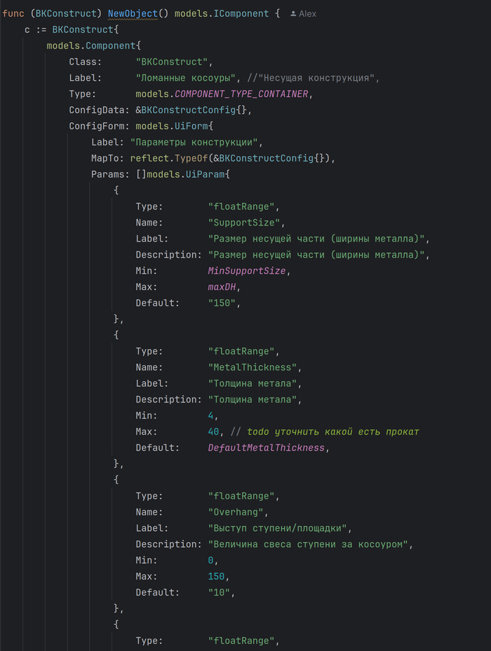 Функции, отвечающие за построение деталей, выглядят как бред сумасшедшего. Есть идея создать собственный графический язык и транслировать его в Go-код, который позволит расставлять точки и задавать их зависимости от других параметров. Например: расчертить контур, выбрать точки и указать, что они привязаны к каким-нибудь другим точкам. Спасает то, что часть кода удаётся наследовать и переиспользовать.