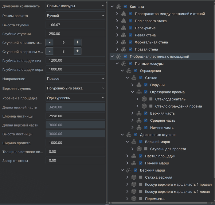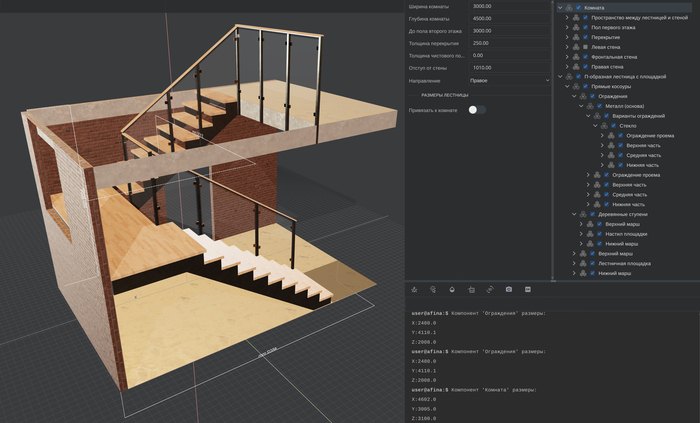 В итоге пришли к такой идее: у нас есть некий компонент — набор свойств, родителей и детей. Каждый компонент может обращаться к дереву компонентов по имени, классу или по другим параметрам, передавать им указания — например, «измени свои габаритные размеры на вот столько» или «используй такой тип крепежа». Интерфейс при выборе компонента автоматически отрисовывает формы ввода для свойств. У компонента может меняться набор дочерних компонентов — например, лестница может быть построена на прямых либо ломаных косоурах, тогда компонент «комната» просто получает другого ребёнка. У компонента есть эвенты (события), он может реагировать на какие-то события — например, компонент «косоур» может узнать о том, что изменился тип крепления. Компоненты связаны друг с другом не только в логическом дереве, но и геометрически: точка отсчёта координат для компонента зависит от его родителя.