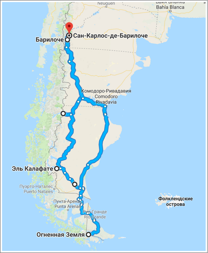 Из Буэнос Айреса долететь до Барилоче, там взять машину и поехать вниз по карте (на юг) вдоль скалистого хребта Анд, заезжая на территорию Чили, доехать до края земли (город Ушуайя) и вернуться в Барилоче, чтобы покататься там по территории национального парка и сдать машину.