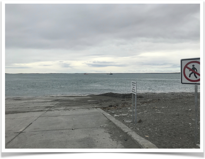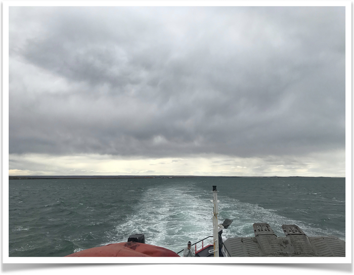 Границу прошли быстро и домчали до переправы (на наши деньги переправить одну машину стоит около тысячи рублей - платить можно как чилийскими, так и аргентинскими деньгами). Платить надо на пароме, но его еще надо дождаться, чем мы и занялись (не сложное в общем занятие). И вот что произошло - это место, паромная переправа, серая вода, волны вызвали очень странное ощущение, которое я понял только через месяц наверное. Сейчас поясню. Мы ехали на край земли. Ну, это то место, где на карте заканчивается коричневый цвет, обозначающий сушу, и начинается синий (начинается и довольно долго продолжается, пока не упирается в белый цвет Антарктиды). Вот такой классический край земли. Теперь посмотрите на фотографии паромной переправы.