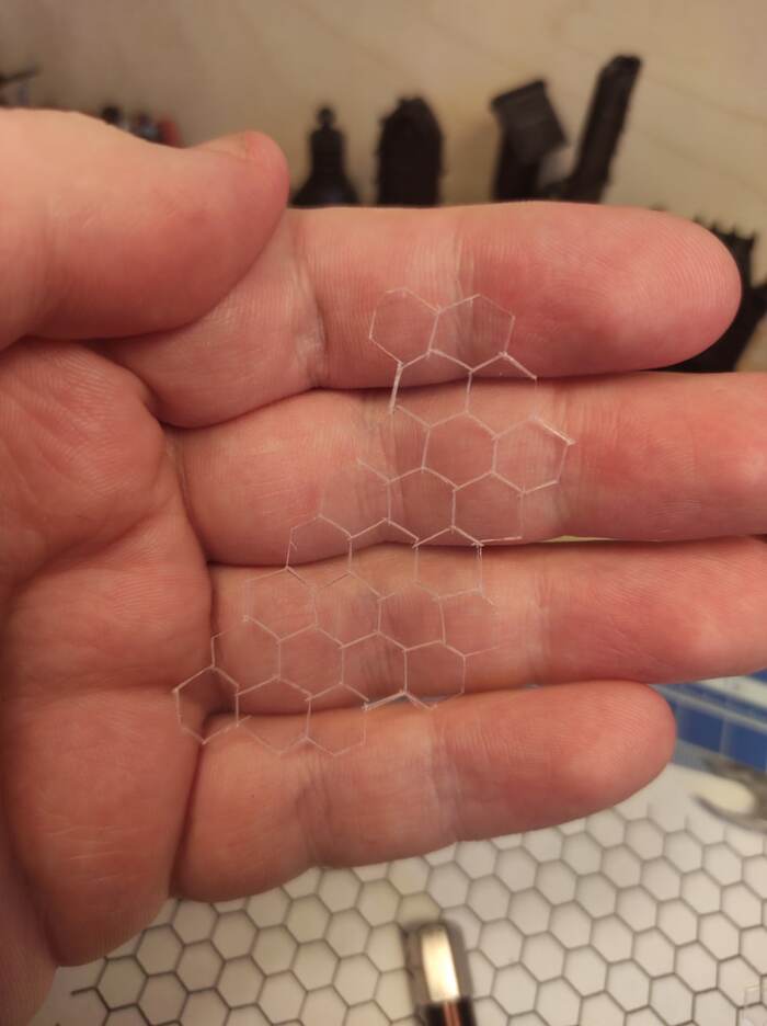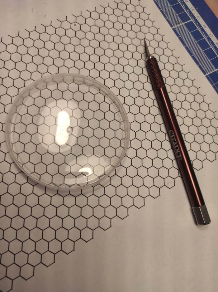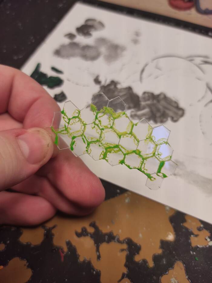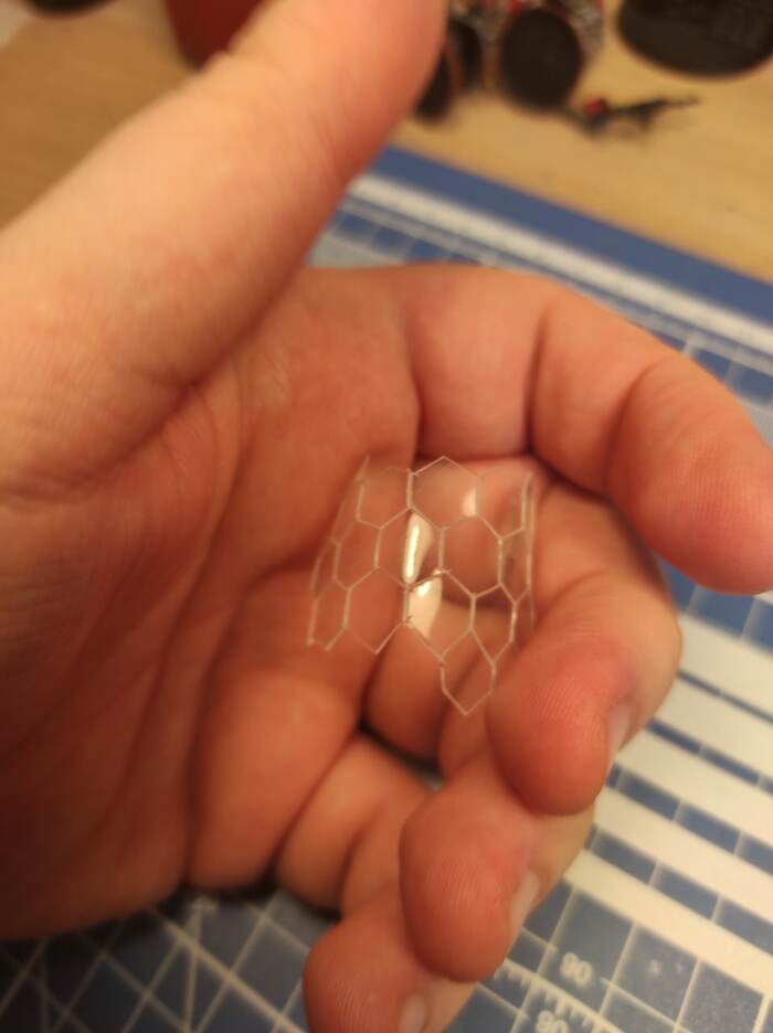 Из интересных решений можете ножом вырезать часть гексов внутри заготовки, что бы сделать эффект пробития щита.