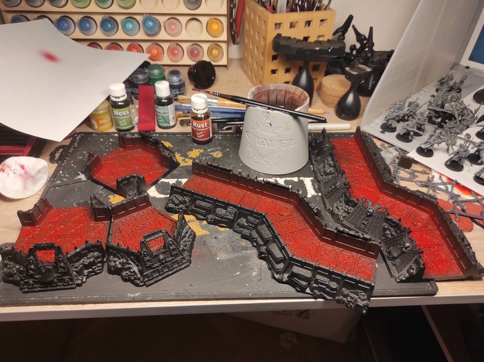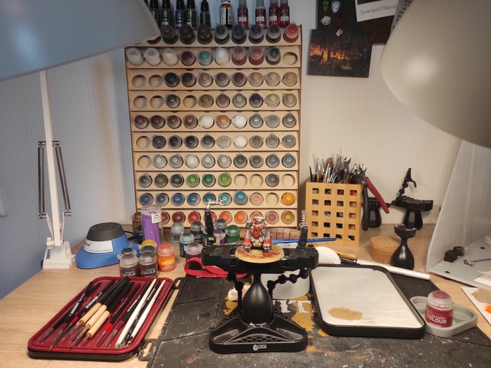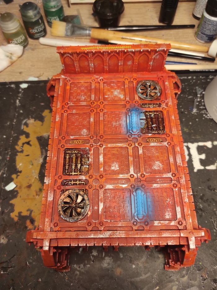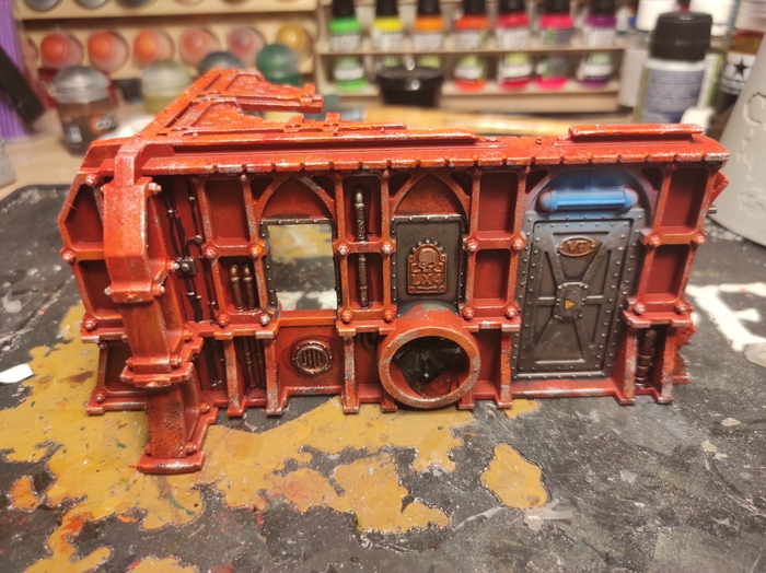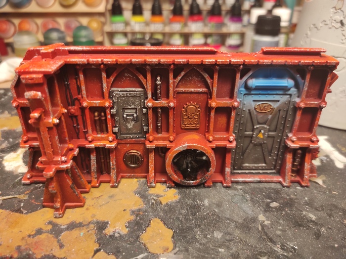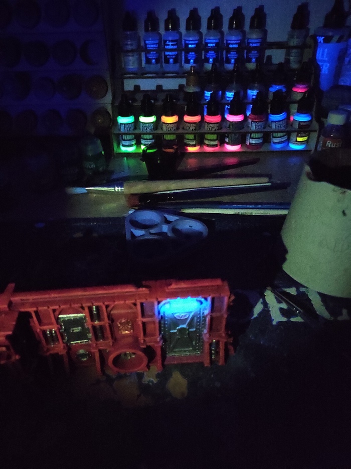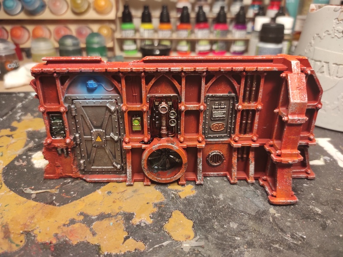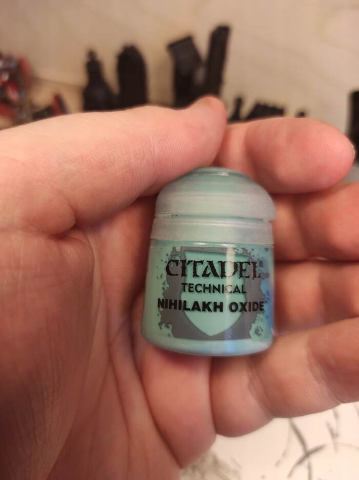 Все краски покупал в хоббийных магазинах в VK. Легко ищутся по поиску товаров. Как итог добавив 4 технички в базовый покрас, как по мне мы получаем максимально атмосферную базу. Что-то вроде затопленных технических коридоров спейс халка. А во мраке видим кто-то наблевал эктоплазмы, а на вентиляторе каспера нашинковало. И что главное нанес и забыл, никаких сложных техник.