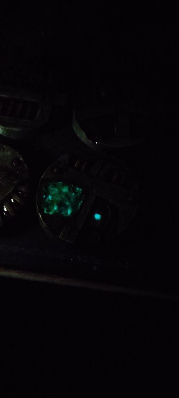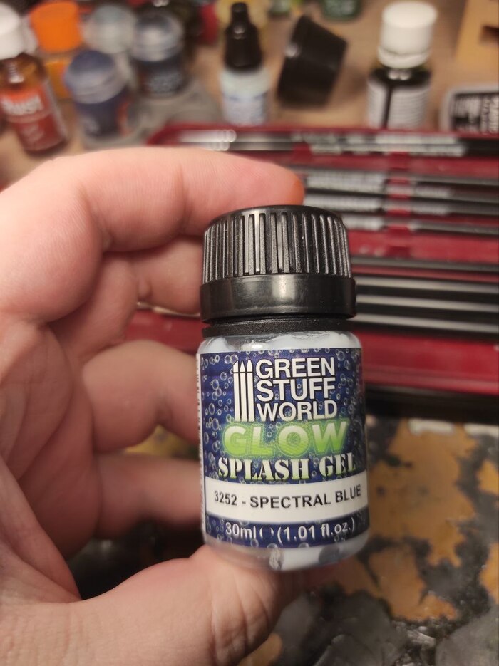 Но нам этого мало. Хочется чего-то необычного и страшного. Для этого используем красочку от Green Stuff World - GLOW SPLASH GEL. Он при нанесении дает эффект свечения в темноте. По опыту скажу что тонкий слой его или разбавленный водой гель плохо светится. Для внятного эффекта лучше наносить его много. Но тогда плохо становится видно детали базы.