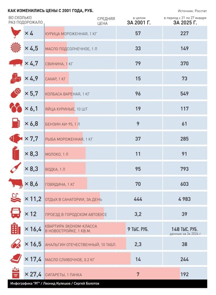 А вот цены по широкому списку товаров и услуг, которые отслеживает Росстат, с начала века выросли в 8 раз, или на 700%, пишет «Российская газета». При этом цены на жилье увеличились в 16 раз, а пачка сигарет — в 27 раз.