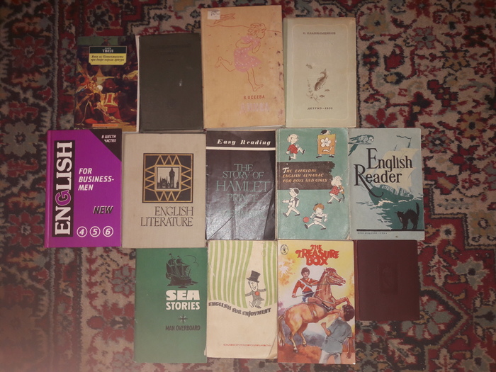 Коричневая - немецко-русский словарь. Желтая - В. Осеева "Динка". Серая - Н. Плавильщиков "Жизнь пруда. В этом же ряду Марк Твен "Янки из Коннектикута при дворе короля Артура". Бордовая - Merchant of Venice Шекспира (в оригинале). Остальные книги на английском языке.