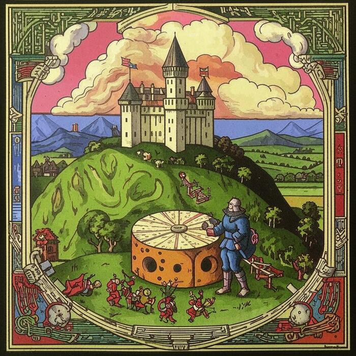 Король Кунилир, известный своей смелостью и храростью, собрал своих советников в тронном зале. Они обсуждали возможные меры по спасению королевства от наводнения. Но чем больше они говорили, тем больше становилось очевидно: обычные методы не помогут. В этот момент король встал и громко произнес: "Мы должны использовать то, что у нас есть! Сыр — это наше главное богатство! Мы построим гигантскую катапульту и метнем в небо огромный круг сыра!"