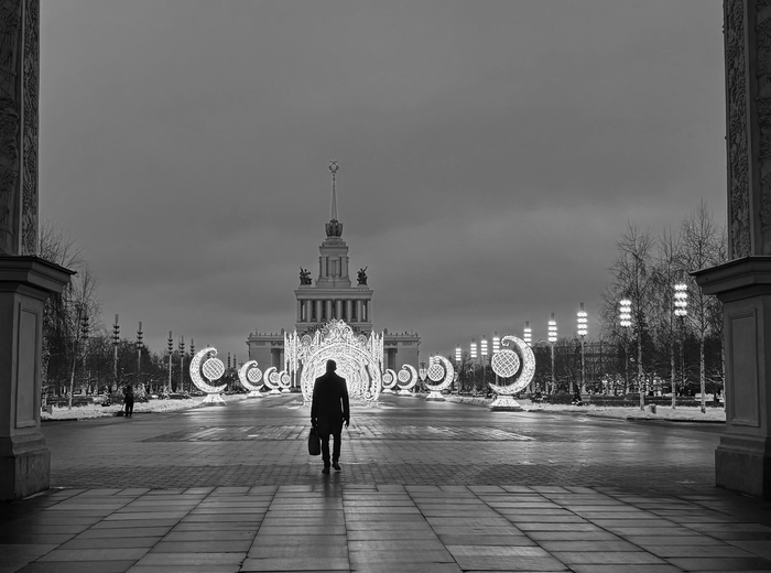 На ВДНХ работает много людей. И утром они идут туда на работу, как и в любой офис. А мне часто пишут, что мое пристрастие к монохромным фотографиям говорит о депрессивности и унынии. Может быть и так. Продолжаю считать себя унывным и восторгаться фотографиями в чб. Кстати есть чудное сообщество людей, которые фотографии еще и печатают. Хочу к ним вписаться как-то.