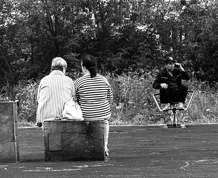 Проходя мимо одной из детских спортивных площадок расцветка одежды отдыхающих дам чем-то напомнила арестантские робы. А откровенно доминирующий и использующий совершенно не по-назначению, а как ему заблагорассудилось спортивный снаряд приезжий специалист тут выступает в роли надсмотрщика. Или, возможно, я слушал фоном лекцию о трагедии в Освенциме и навеяло. Нагнетать не буду.