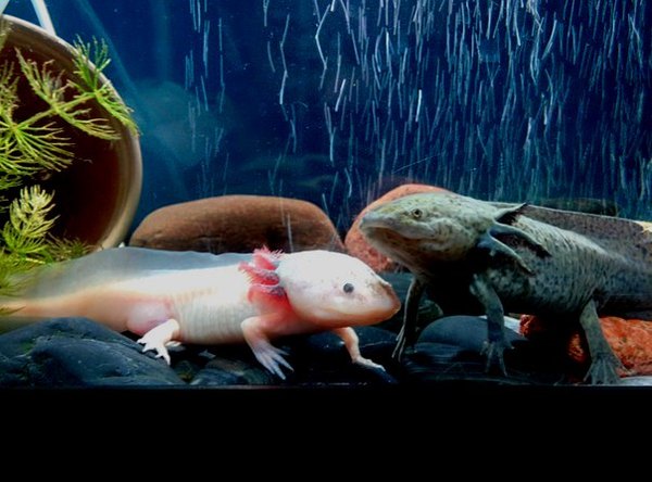 Аквариум. Литраж от 40 литров на одну особь плюс 20 литров на каждую последующую особь. Фильтр и аэратор обязательны. Без аэрации жабры у аксолотлей лысеют, а отрастают они ой как медленно. Аксолотли любят прятаться, поэтому в аквариуме обязательно наличие укрытия (грот, пещерка, керамический горшок) без острых углов.