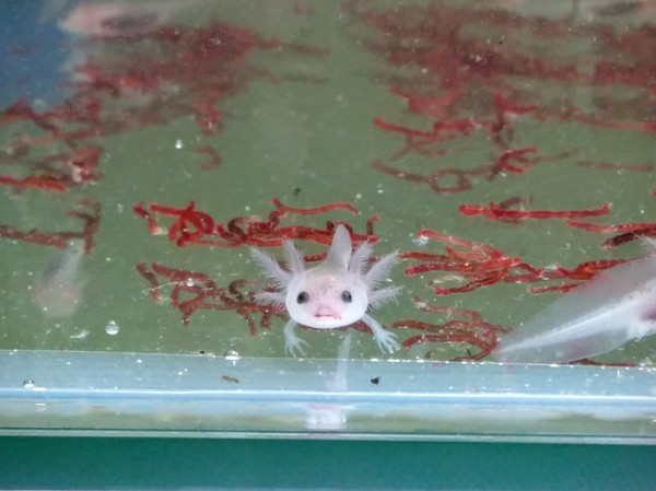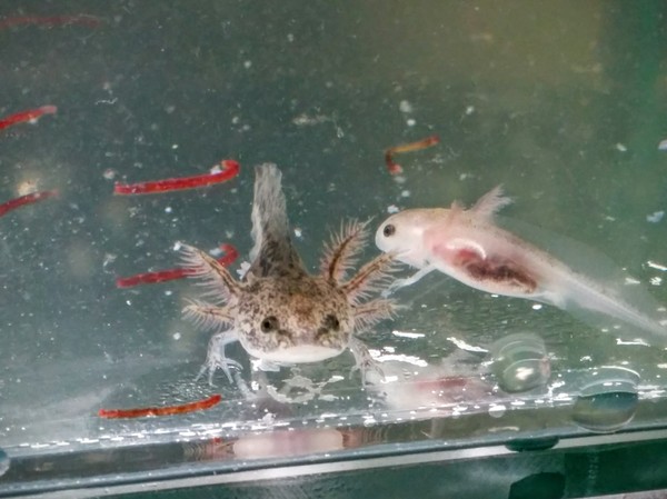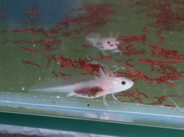 Еда. Распространённое заблуждение, что аксолотлям можно мясо, курицу и субпродукты. Никогда, ни за что. Мясо теплокровных животных переваривается лишь на 20%, остальные 80% просто гниют в желудке, вызывая запоры и провоцируя инфекции. Поэтому, исключительно СЫРО мороженный морской коктейль (креветки, мидии, кальмар, осьминог), мясо нежирной рыбы и, так называемая, «живая еда» - гуппи и мелкие креветки типа черри.