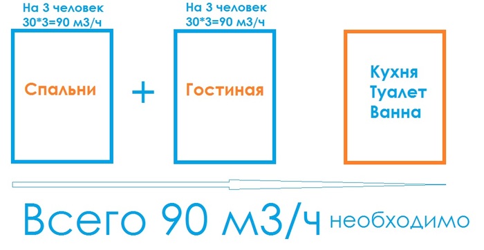 При параллельной планировке нам необходимо давать одно и то же количество воздуха на семью, как в спальни, так и в гостиную (для трех человек = 3*30м3/ч + 3*30м3/ч = 180 м3/ч)