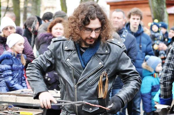 А в завершении мероприятия, Гильдия кузнецов торжественно принимала в свои ряды кузнецов молодого мастера, Илью Саматова. Для обряда посвящения в кузнецы он должен был самостоятельно выковать гвоздь, под зорким оком опытных наставников, а после выпить чарочку прямо с кузнечного молотка.