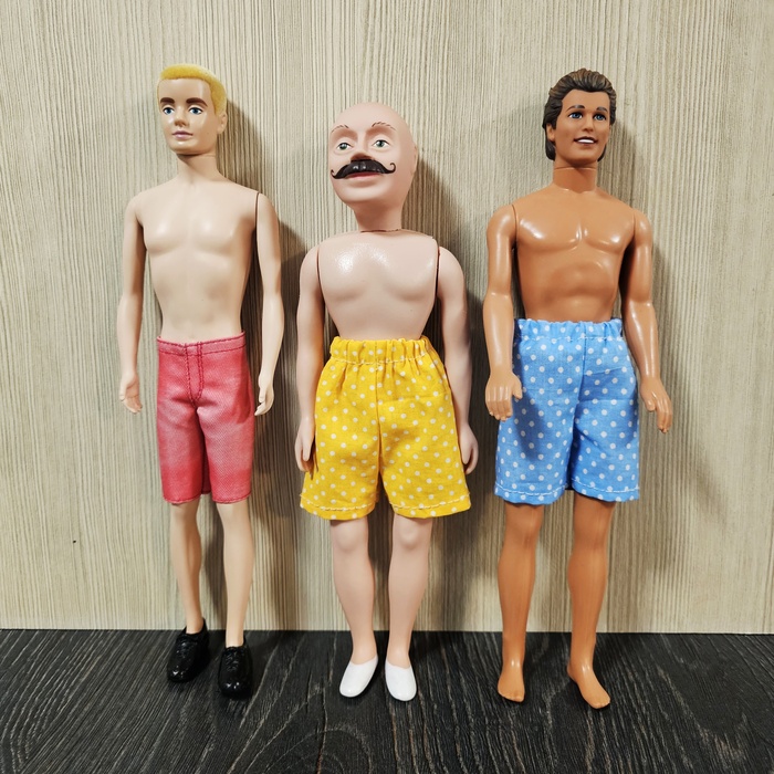 И ещё сравнительное фото с американскими коллегами - тонконогий парнишка слева - это современная репродукция Кена 1963 года выпуска - так выглядел самый первый Кен в истории, а справа - Алан, друг Барби и Кена из 90х, тело полностью идентично телу Кена (просто от самого Кена я недавно избавилась - не понравилось его выражение лица, ищу из другой серии). Цветовая гамма штанов не несёт никакой политической подоплёки! Просто какая попалась под руку ткань, такие и сшила труселя - курс был на горошек)))
