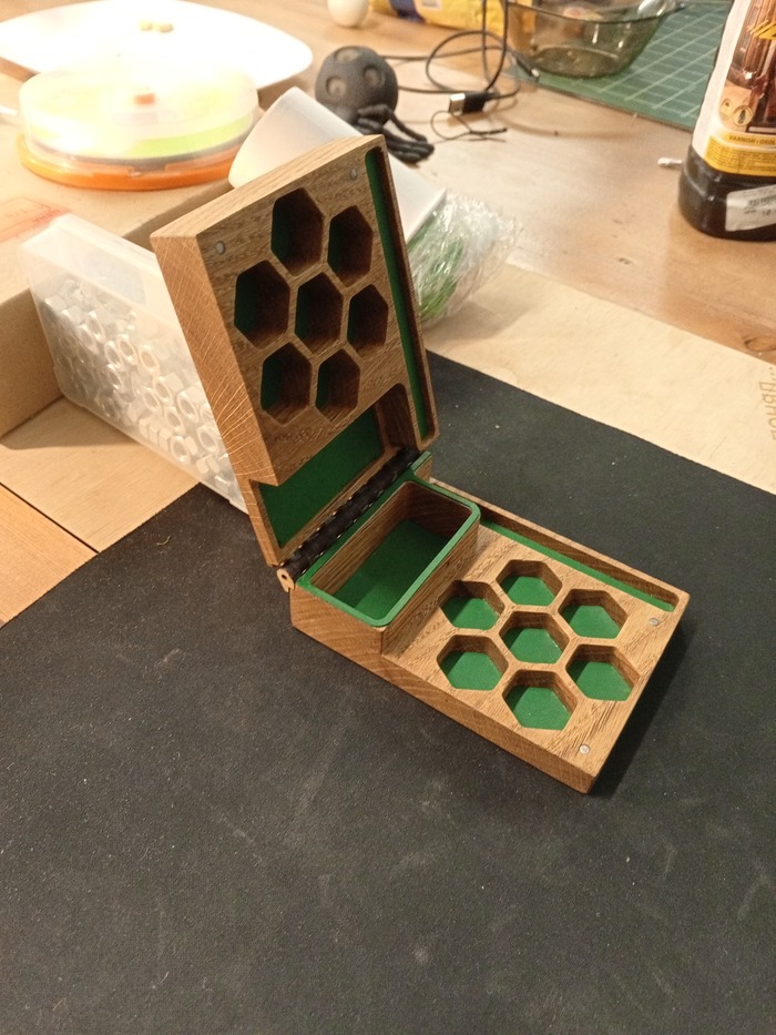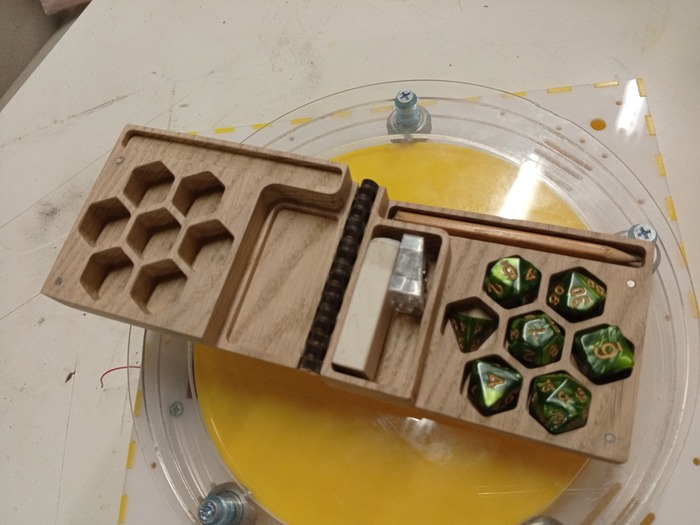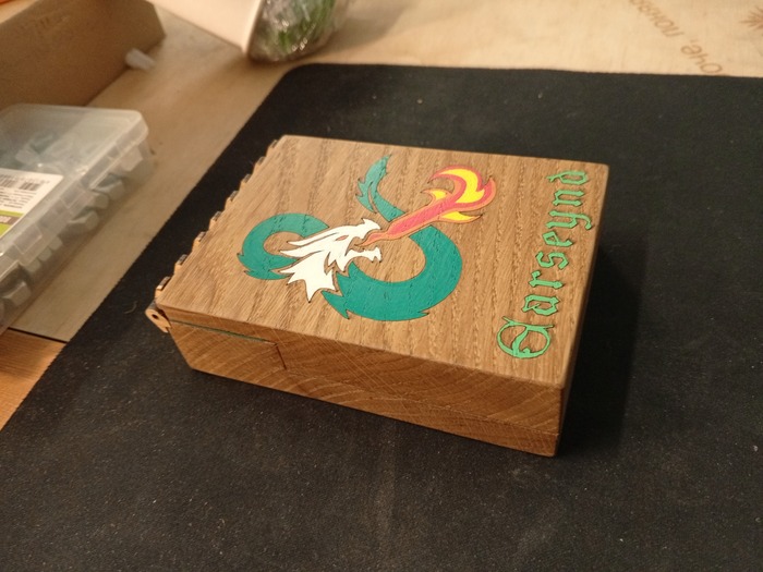 Поигрываю иногда в dungeons and dragons. Не начал сначала делать шкатулки для дайсов (костей) себе, а потом подумал, почему бы не порадовать других. Начал делать именные шкатулочки и раздаривать их начинающим гейм-мастерам в местном клубе. Пока-что сделал две. Хочу, чтобы каждая шкатулка была уникальной, поэтому никакой постановки на поток.